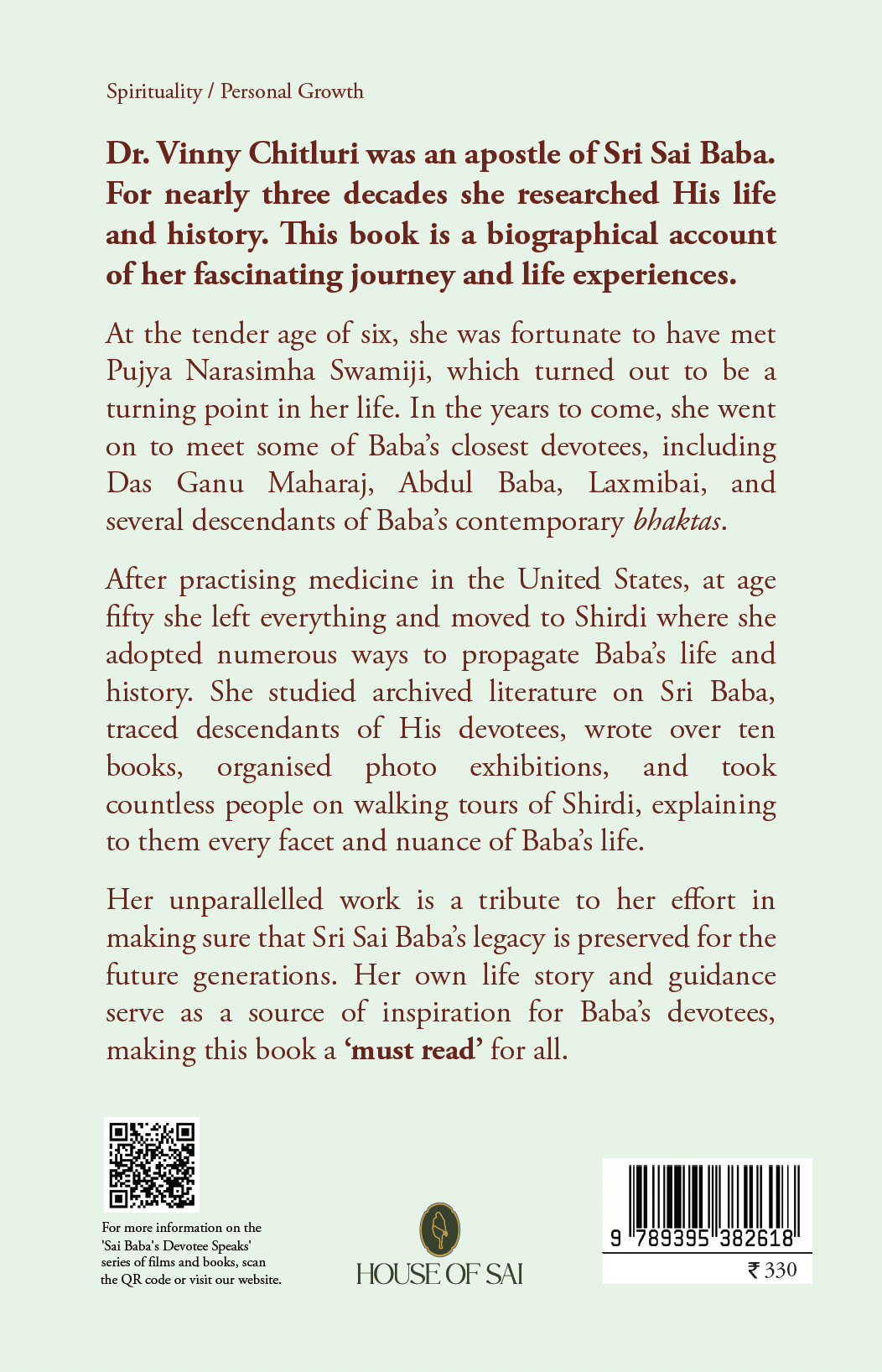 Dr. Vinny Chitluri was an apostle of Sri Sai Baba. For nearly three decades she researched His life and history. This book is a biographical account of her fascinating journey and life experiences.