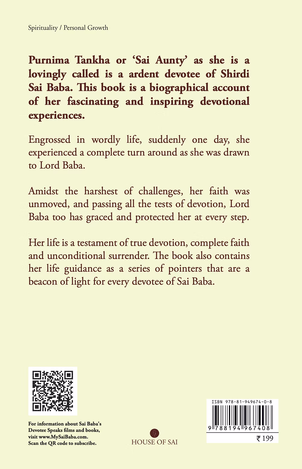 Purnima Tankha or 'Sai Aunty as she is a lovingly called is a ardent devotee of Shirdi Sai Baba. This book is a biographical account of her fascinating and inspiring devotional experiences.