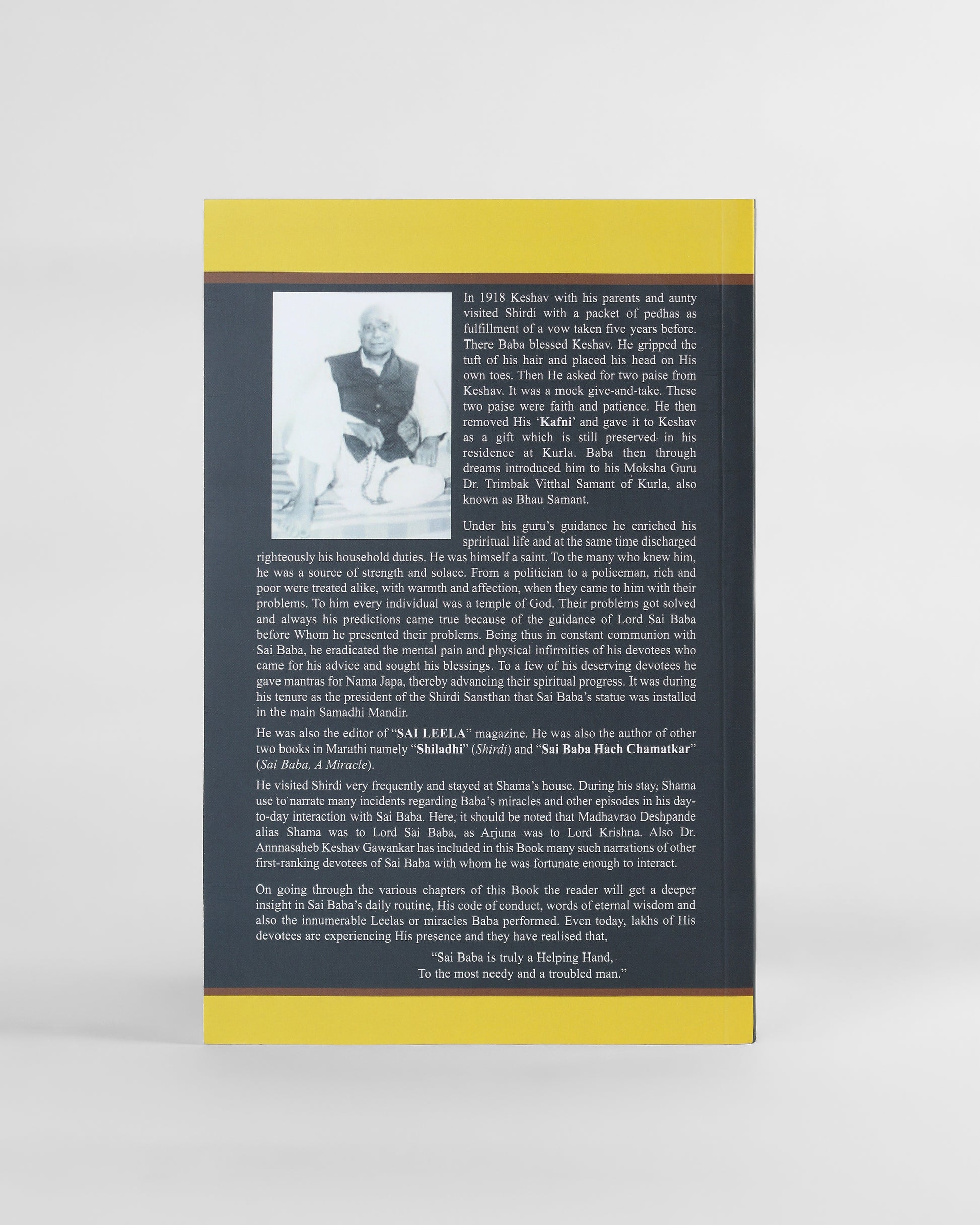 He visited Shirdi very frequently and stayed at Shama's house. During his stay, Shama used to narrate many incidents regarding Baba's miracles and other episodes in his day-to-day interaction with Sai Baba. Here, it should be noted that Madhavrao Deshpande, alias Shama, was to Lord Sai Baba as Arjuna was to Lord Krishna. Also Dr. Annnasaheb Keshav Gawankar has included in this book many such narrations of other first-ranking devotees of Sai Baba with whom he was fortunate enough to interact.