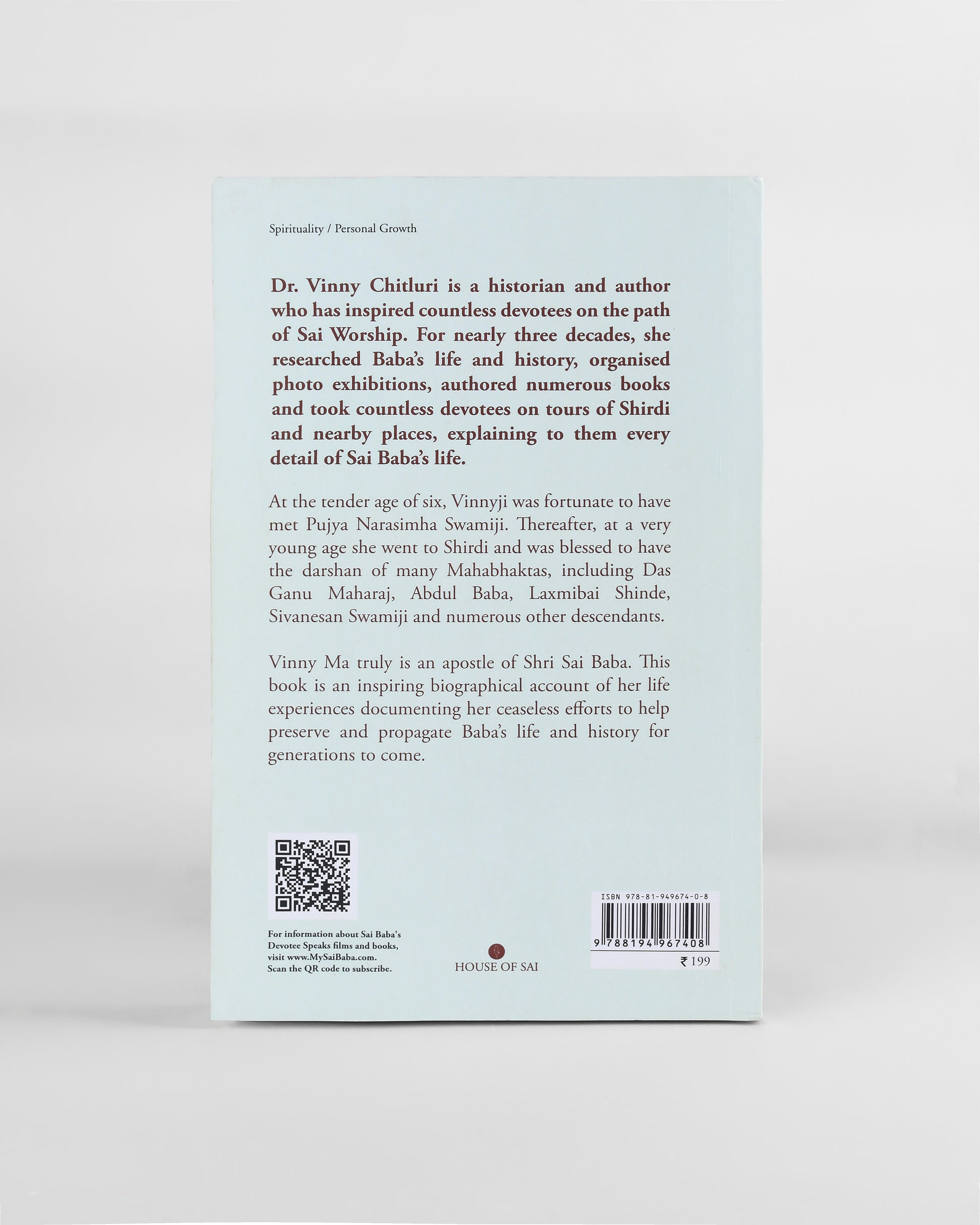 Vinny Ma truly is an apostle of Shri Sai Baba. This book is an inspiring biographical account of her life experiences documenting her ceaseless efforts to help preserve and propagate Baba’s life and history for generations to come.